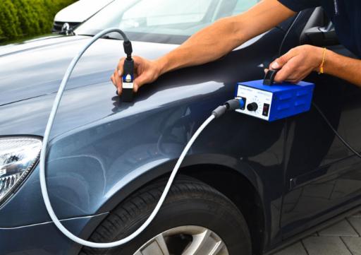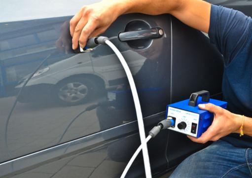 Mit diesem Gerät können weiche, kleinere Dellen innerhalb von wenigen Minuten aus der Karosserie zurückverformt werden, ohne dass ein lackieren der Fahrzeugteile erforderlich ist.